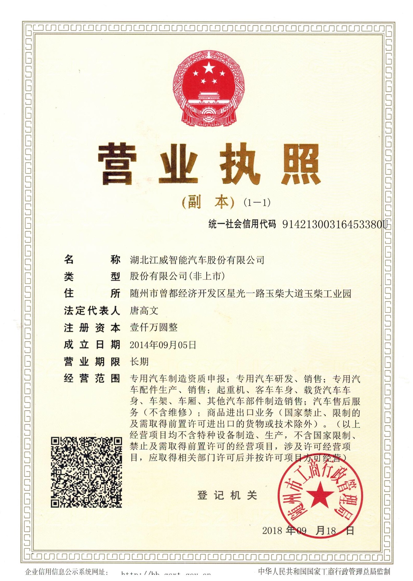 公司以質(zhì)量求生存,以誠信求市場,以服務(wù)求信譽,以研發(fā)求發(fā)展,以智能化、功能化來實現(xiàn)社會價值,湖北江威智能汽車股份有限公司熱忱歡迎廣大新老客戶、社會各界朋友惠顧,期待您的實地考察,“江威智能”會為您提供優(yōu)質(zhì)的產(chǎn)品、貼心的服務(wù),讓您用得放心,用得滿意.