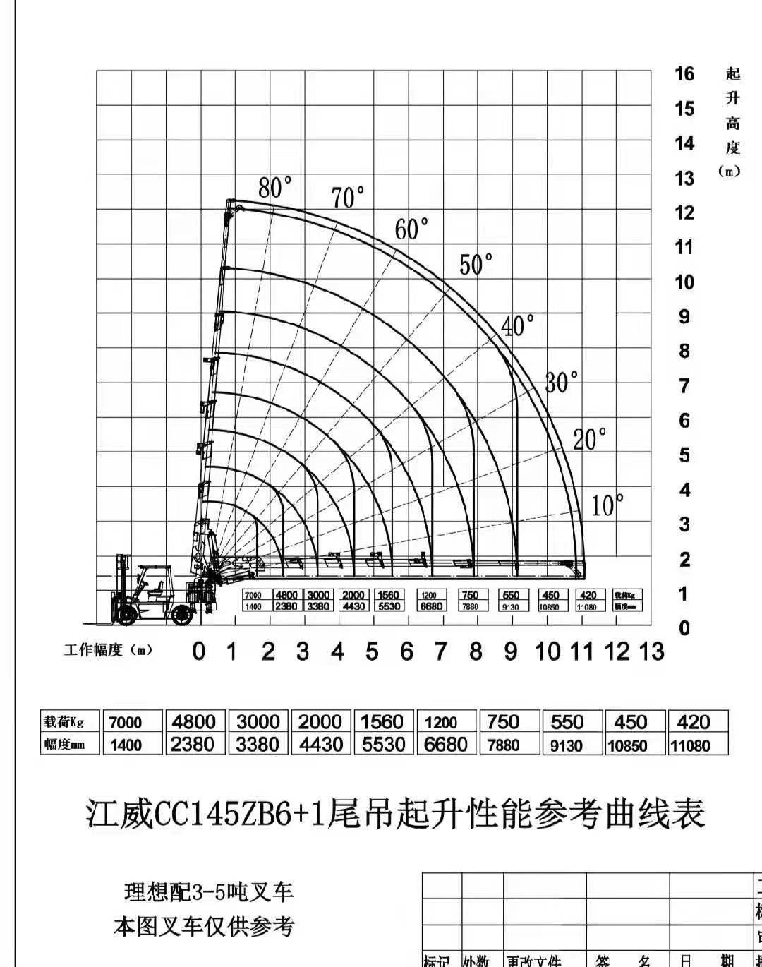 可裝在5噸或5噸以上的叉車上,6節液壓一節手拉,帶彎頭副臂,最大工作半徑11米。相比前飛臂吊優勢:可360度旋轉,帶3條支腿,不出臂吊6噸,全部升出吊0.5噸。
