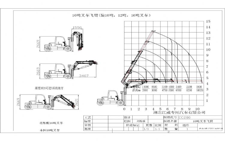 10噸叉車飛臂吊機,最大工作10.2米(加長版),全部升出可吊1.8噸,高度13.2米(按叉車長高3米計算)。