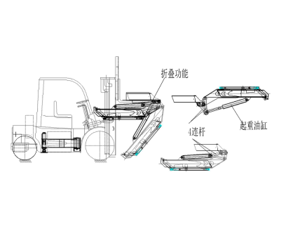 4、 起重采用4連桿運(yùn)動,放大油缸的起重力,且實(shí)現(xiàn)折疊功能。