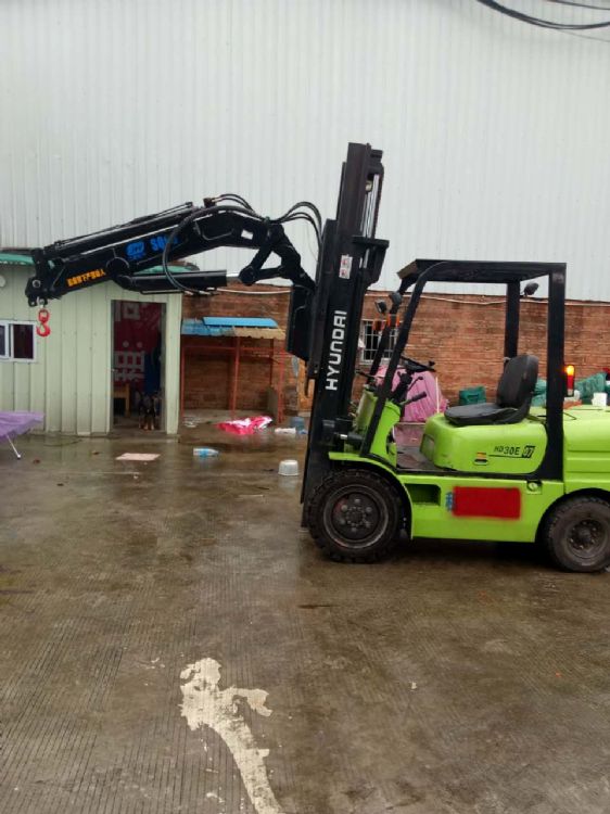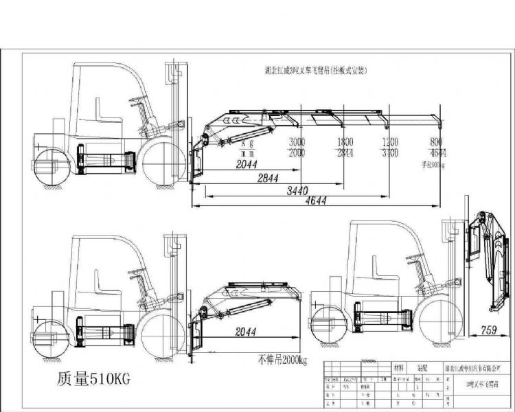 3噸叉車飛臂吊機,最大工作4.644米,全部升出可吊0.8噸,高度9米-10米。