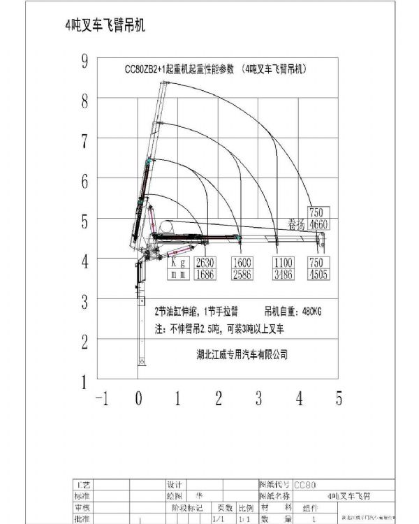5噸叉車飛臂吊機,最大工作4.642米,全部升出可吊0.85噸,高度7.642米(按叉車升高3米算),可加裝高空作業欄,卷揚,加長臂等等 。