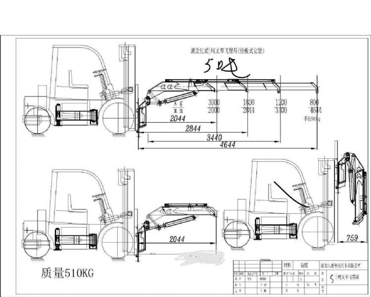 5噸叉車飛臂吊機,最大工作4.644米,全部升出可吊1噸,高度9米-10米.