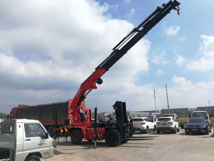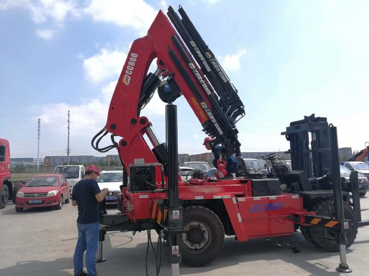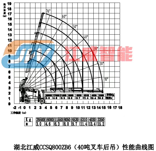 江威40噸(SQ800)全折臂吊機,4米吊20噸,5米吊15噸,整車高度低于2.9米。整車長度4.6米〈不含叉子)工作半徑16.8米,6節(jié)液壓伸縮加1節(jié)副臂。前叉后吊。可實現(xiàn)原地打轉。360度全回轉