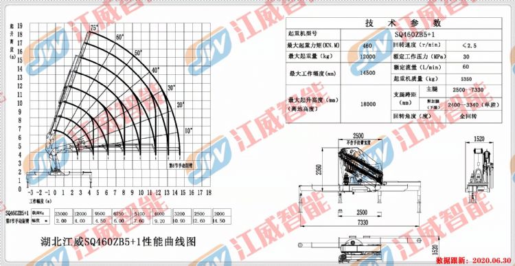 配江威460機,23噸,四米吊13噸,5節液壓一節手拉,最大工作半徑14.5米。車箱尺寸:8200/7800*2450*600