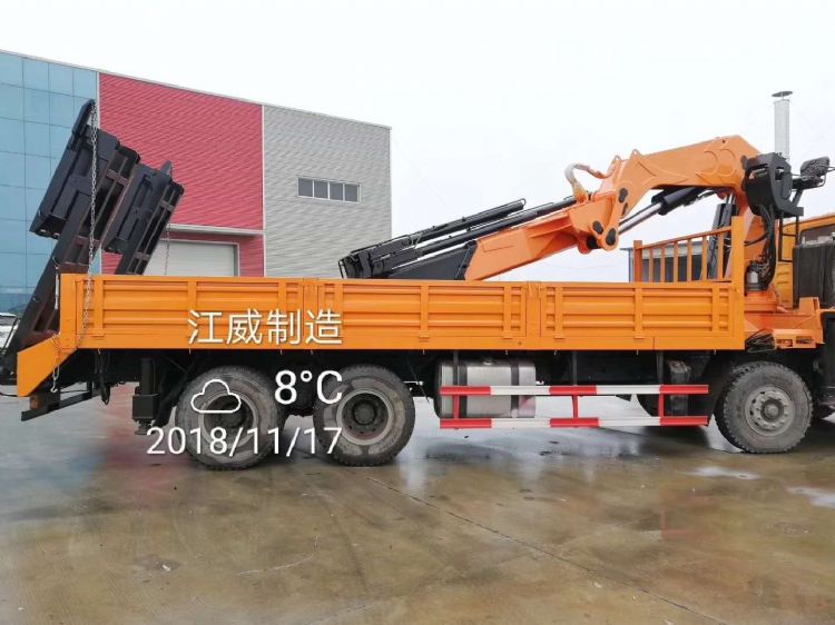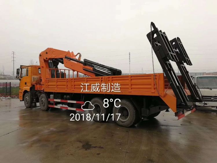 江威34噸隨車吊車箱配置:按標準可做7.9米左右,可選裝平板帶滑梯,可拉挖機。