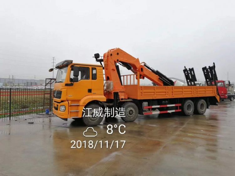 江威34噸隨車吊底盤配置:陜汽德龍M3000,前四后八底盤,軸距:2100+4575+1400,濰柴300馬力發動機,法士特9檔變速箱,前橋7.5噸,后橋13噸,二層局部三層大架(8+5+8),400L油箱,1100鋼絲胎。總質量31噸,整備質量19.43噸,額定載重量11.44噸.