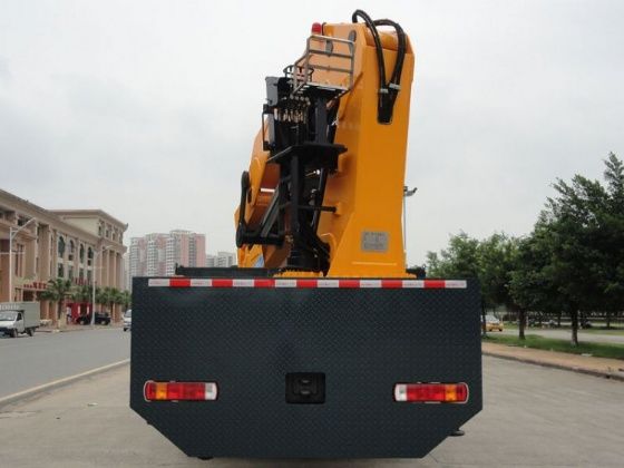 四節折臂50噸隨車吊:工作半徑10.8米,舉升高度18米,最遠起升質量9.5噸,全液壓、360度全回轉。