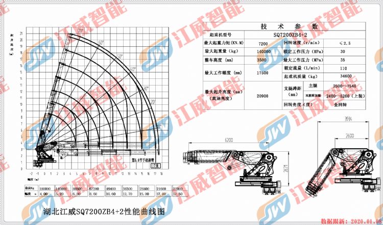 江威7200機(360噸),此機4米吊180噸,4.8米吊150噸,7.5米吊90噸,10米吊60噸,全都是水平距離起吊。
